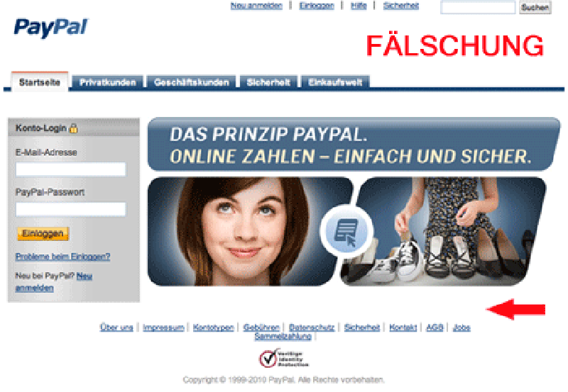 Verwendet man nun den Link, kommt man auf eine der PayPal Seite sehr ähnliche Web-Seite, was aber bei genauerer Betrachtung sofort als Fälschung erkennbar ist.